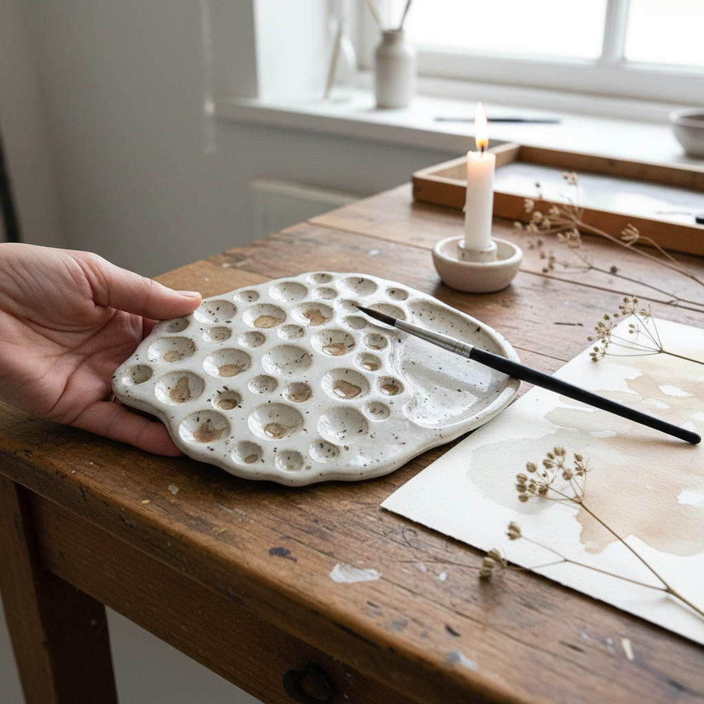 Discover this unique, handmade ceramic painting palette – a perfect combination of art and functionality. This compact palette fits comfortably in your hand, allowing you to paint with ease and precision. The spacious layout offers space for all your watercolor colors, so you can let your creativity flow.