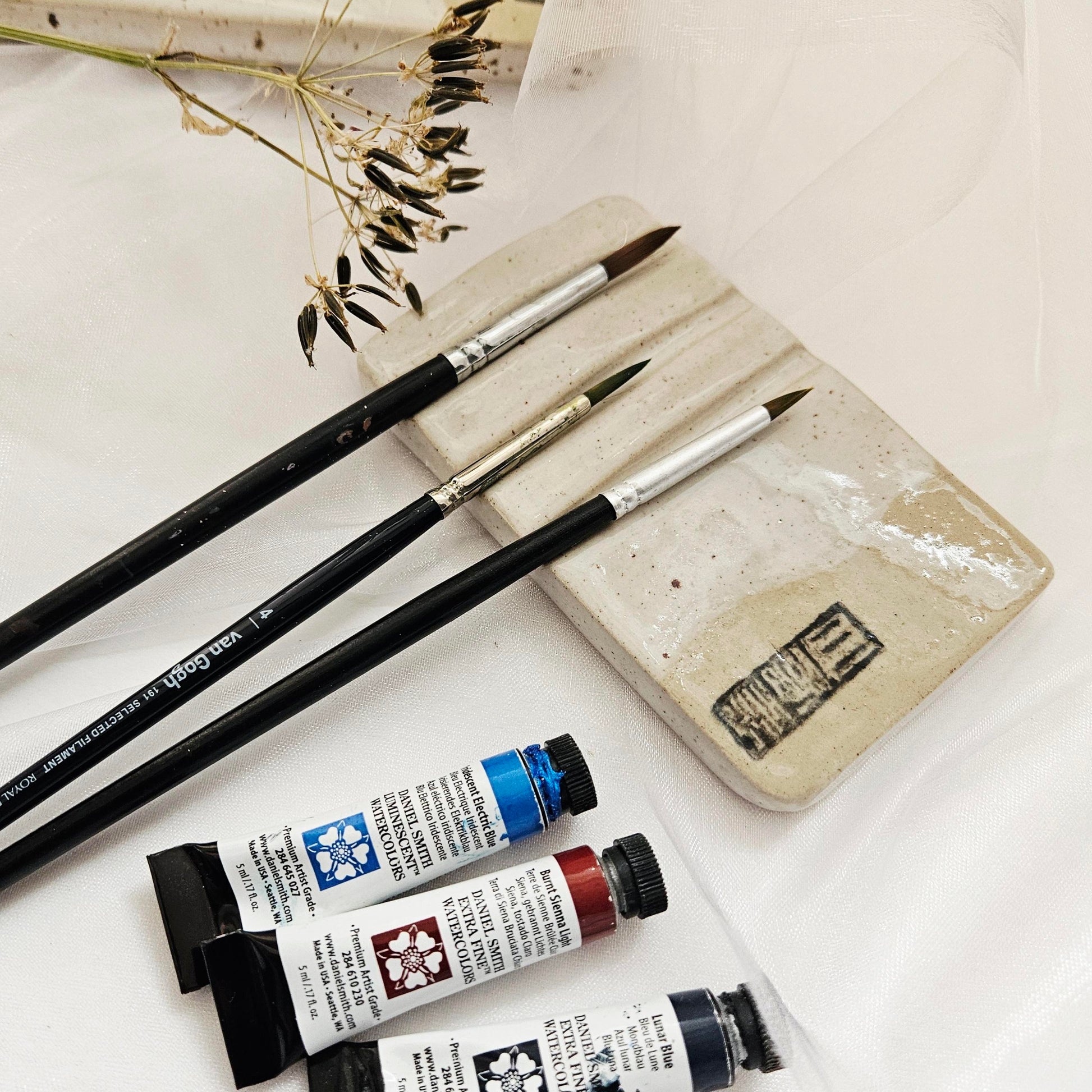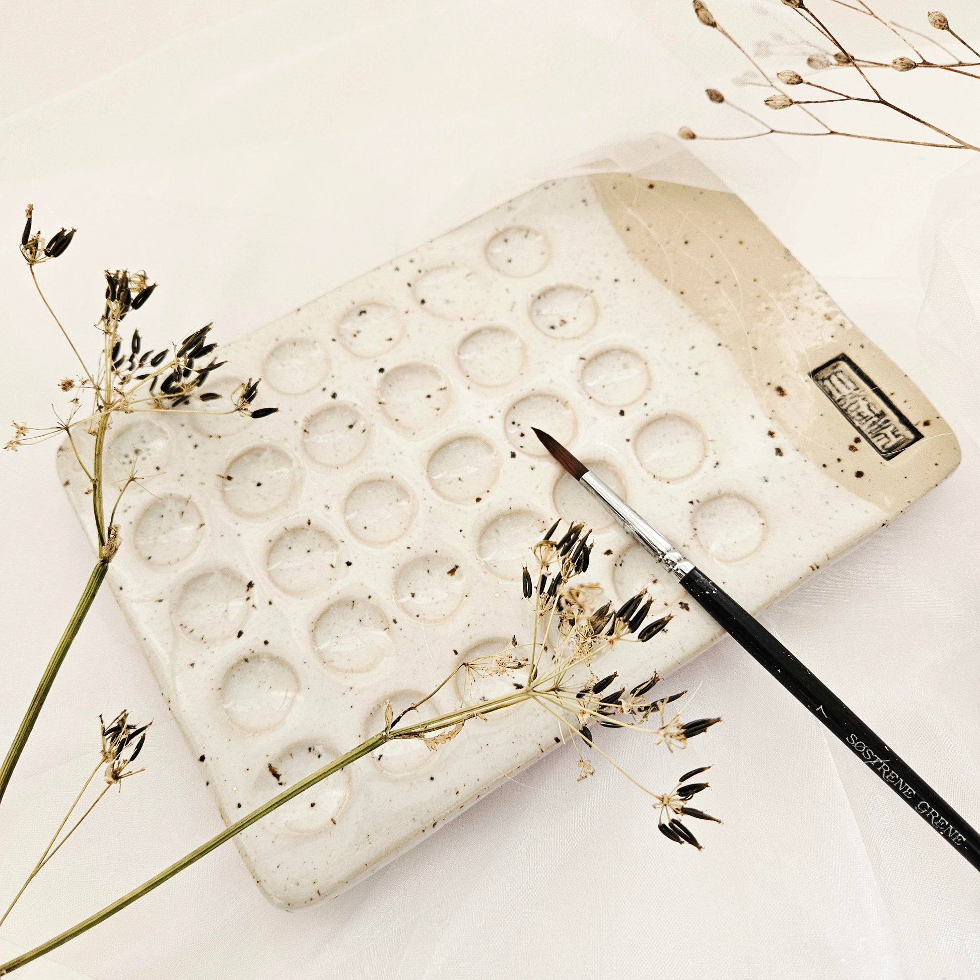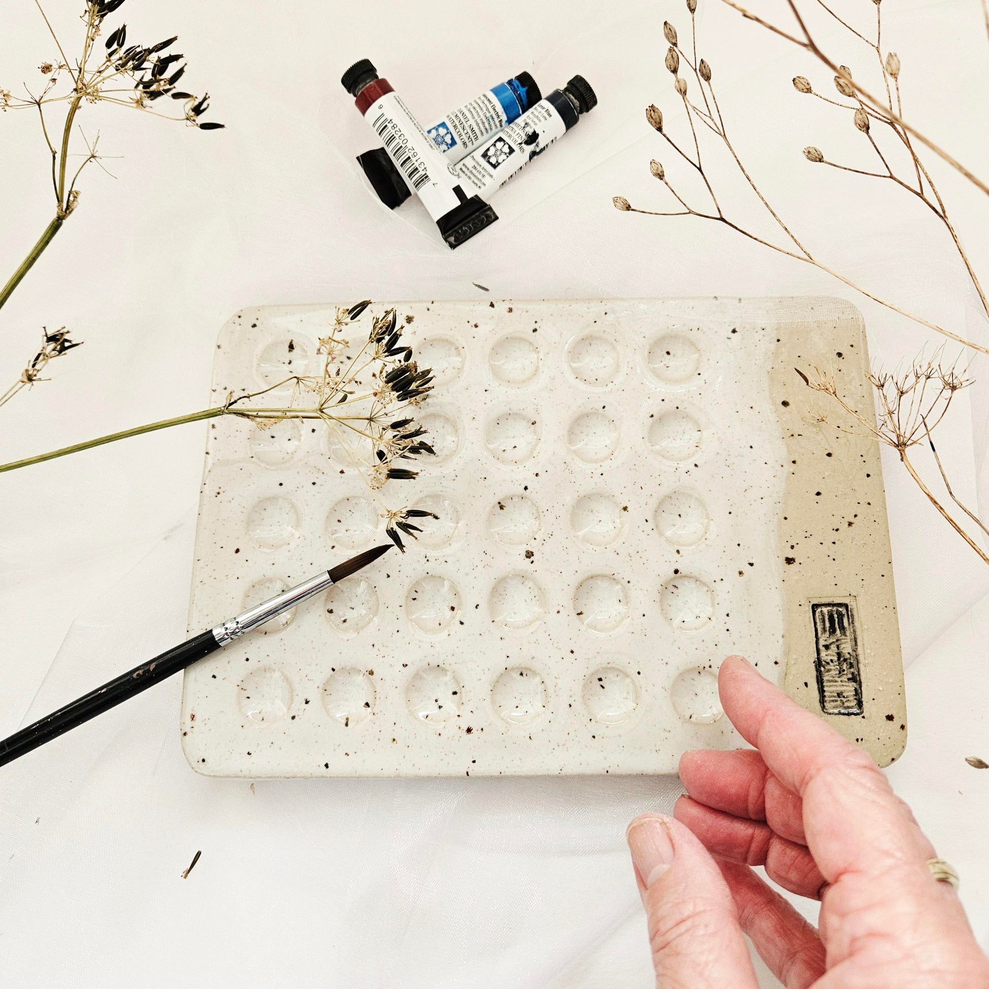 Why this palette brings so much calm to your creative flow: Lovingly hand-formed — each palette carries the energy of craft, care, and stillness. Perfect for watercolor, gouache, and ink — the deep wells keep your pigments pure and clear.