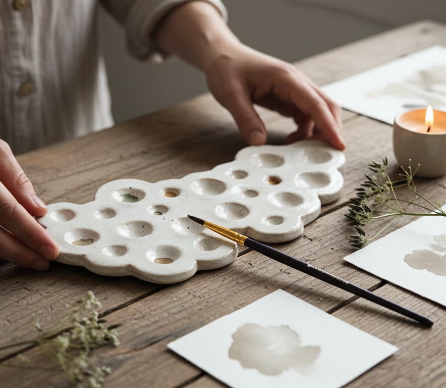 Experience the magic of this unique, handmade ceramic painter's palette - a beautiful combination of art and functionality. The compact size fits comfortably in your hand, allowing you to paint with ease and precision. The many wells offer space for all your favorite watercolor colors and invite you to let your creativity run wild.