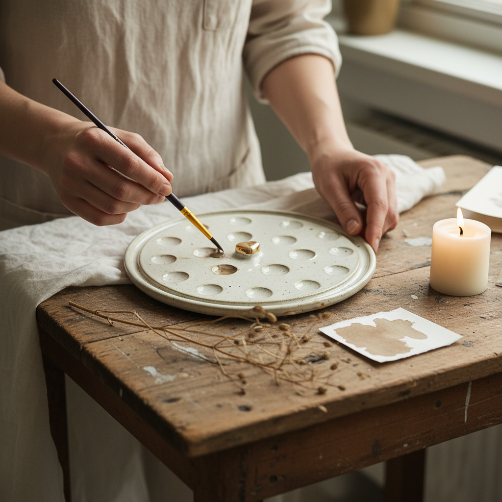 The magic of nature and clay inspires me to create unique ceramic painting palettes. This enchanting golden heart (gold leaf) is surrounded by numerous paint wells. This palette is handmade and carefully glazed to offer a perfect balance between functionality and artistry. Add a touch of nature and imagination to your creative process with this unique ceramic painting palette.
